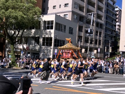休みだったから街に下りておくんちの雰囲気を楽しんできた。 庭先周りは榎津町の川船と賑町の大漁万祝恵比須船にしか出会わなかったけど、旧県庁坂まで行ってお上りの神輿担ぎを・・・日陰は人でいっぱいで日向で見たけど暑かった〜〜〜!!!神輿担ぎの人たちもお上りに参加している人たちも暑くて大変そうだった。その後 浜屋に出店中の梅が枝餅を買いに行って ドン・キホーテでちょっと買い物してから前に働いてたお弁当屋に寄って みんなと一緒にお上りの行列を見て帰って来た。 おくんちも終わったなぁ〜〜〜。